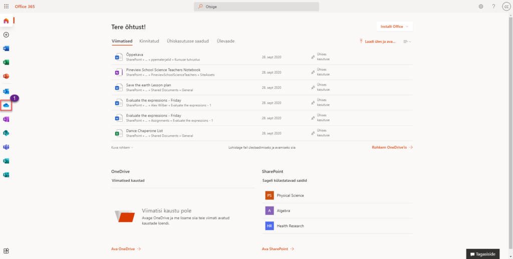 2. Kui olete Office 365 avalehele jõudnud, avage OneDrive vasakpoolses menüüs, klõpsates pilvekujulisel ikoonil.