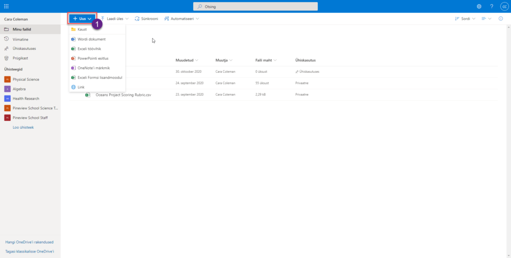 OneDrive avakuval saab luua uusi kaustasid ja dokumente, sealhulgas:
