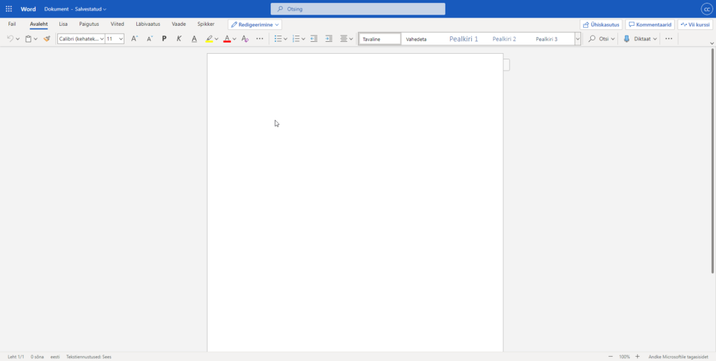 2. Avaneb Office Web Apps dokumendi redigeerimisvaade. Näiteks Wordi dokumendi puhul saate redigeerimist kohe alustada.
