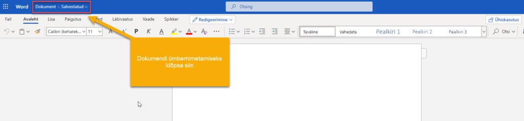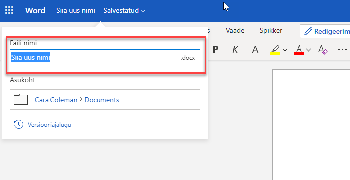 Dokumendi nime muutmine: klõpsake päises sõnal Dokument – Salvestatud, sisestage uus nimi ja jätkake redigeerimist.