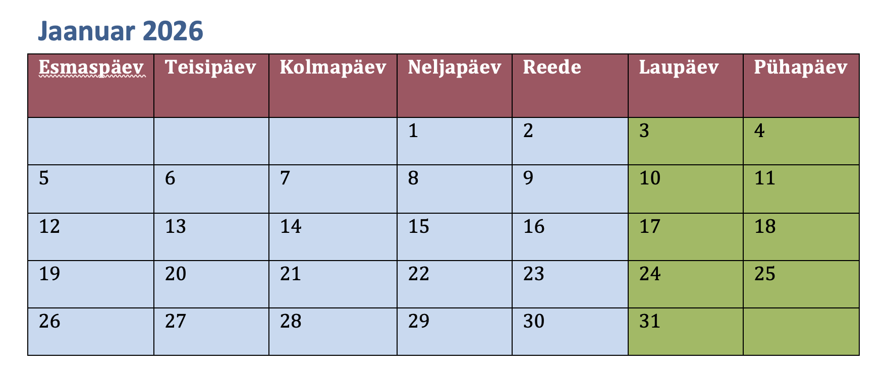 Koosta üks tabelikalender jaanuariks.